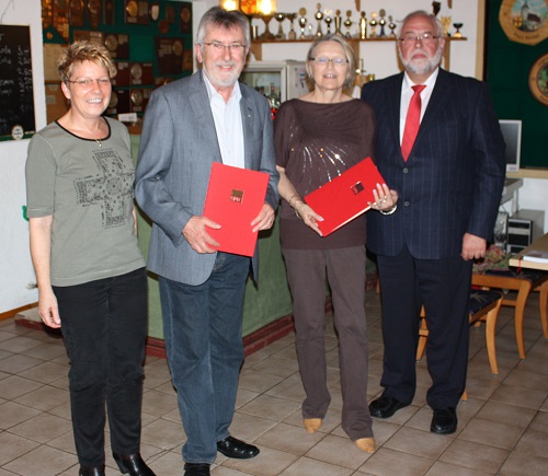 Günther Matz durfte Eleonore Baumstark für 25 Jahre in der SPD auszeichnen und seinen Dank aussprechen. Seit vielen Jahren ist sie im Vorstand des Ortsvereins aktiv tätig. Urkunde, Ehrennadel und "Karl-Marx-Wein" aus Trier waren die Geschenke als Zeichen der Anerkennung.